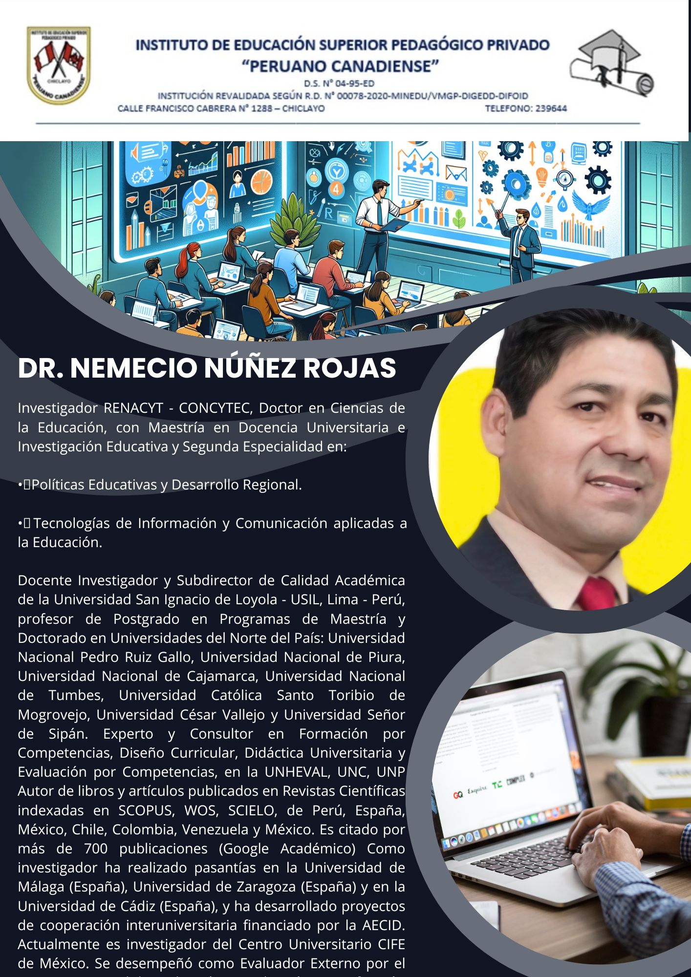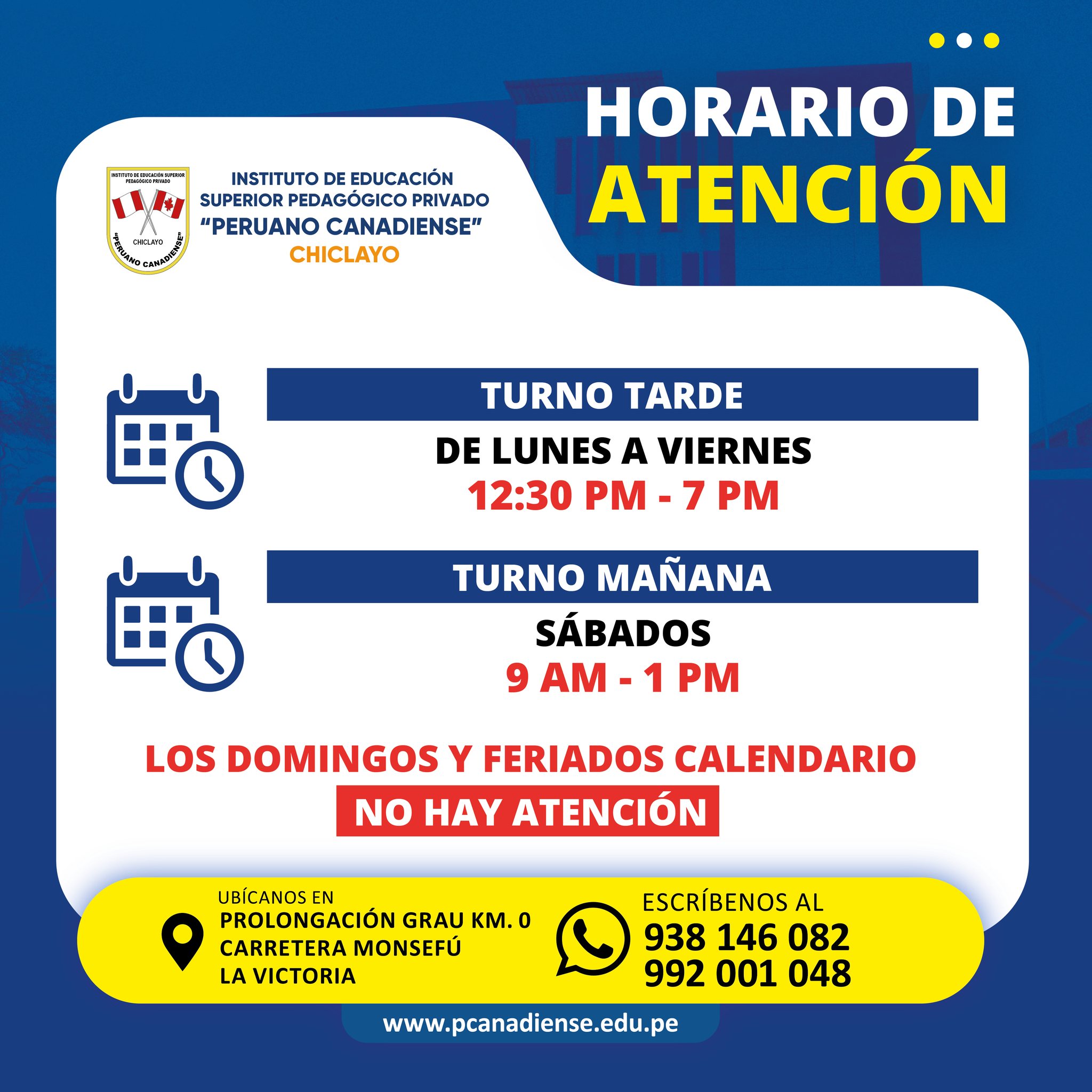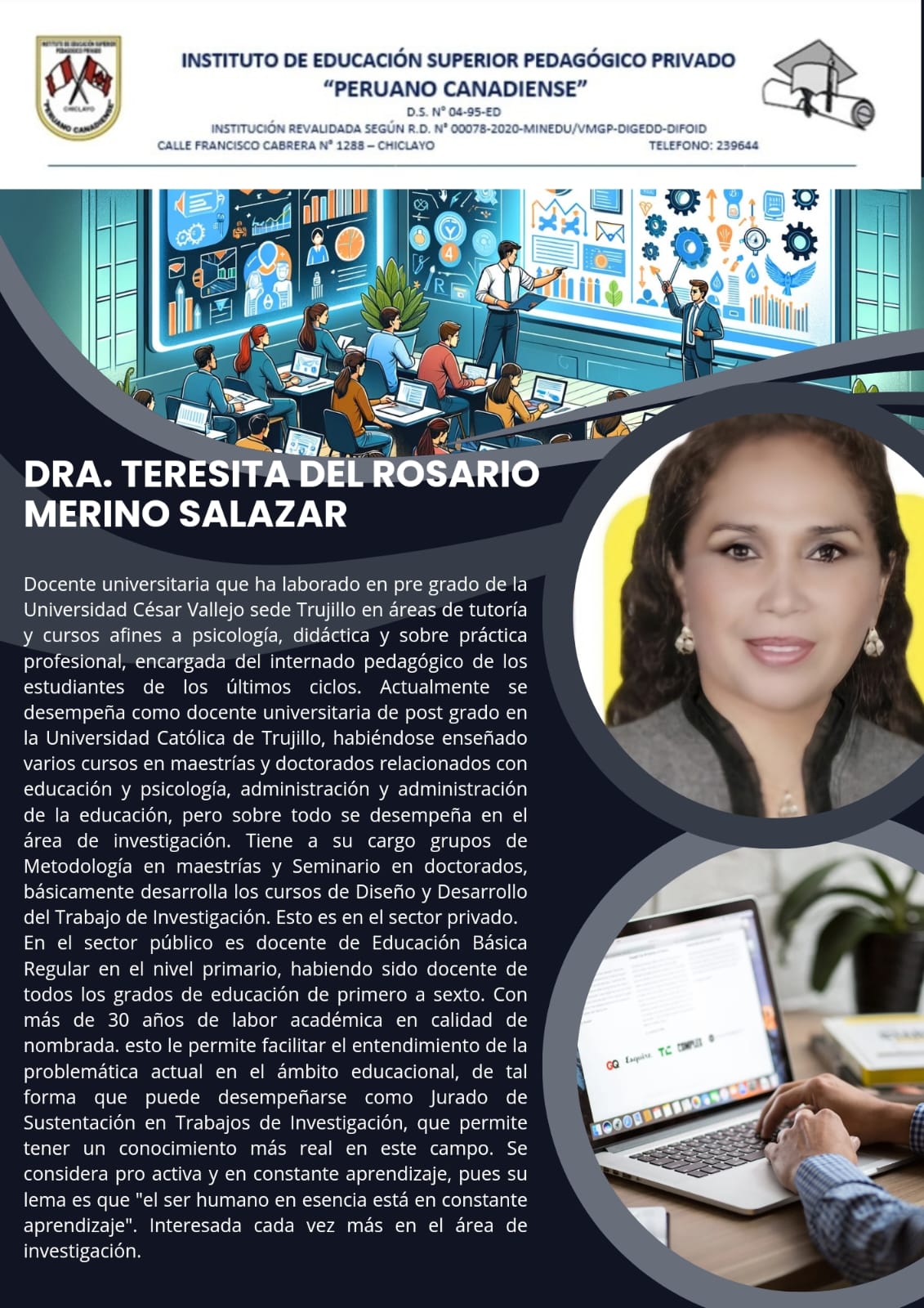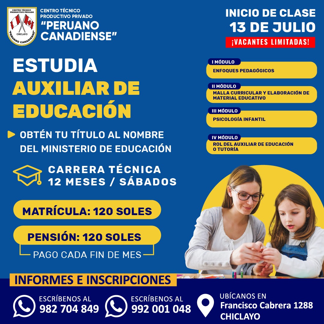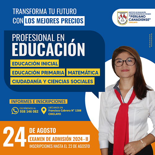 Somos un Instituto Superior Pedagógico que cuenta con más de 31 años de experiencia en el sector educativo en la región de Lambayeque. Nuestros egresados en un gran porcentaje laboran en instituciones educativas públicas y privadas del país. En nuestra región somos un Instituto Superior revalidado por el MINEDU, por lo cual queda demostrada la calidad de nuestros procesos y metodologías de aprendizaje. Así mismo para atender a más jóvenes de nuestra región y ofrecerles una oferta educativa de rápida inserción laboral, además de nuestras carreras profesionales de educación contamos con carreras técnicas de uno y dos años. Así mismo contamos con una infraestructura moderna y que está ubicada en el centro de nuestra ciudad. No dejes pasar esta oportunidad y se un profesional Ya !.