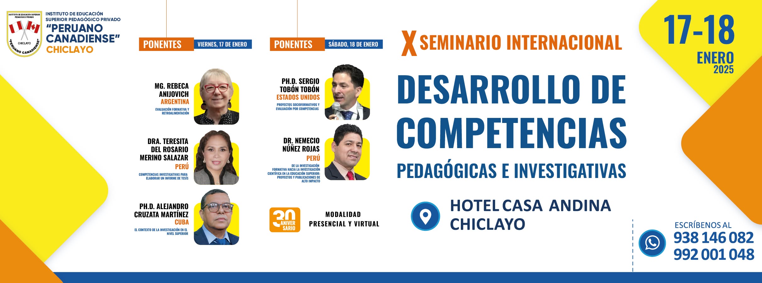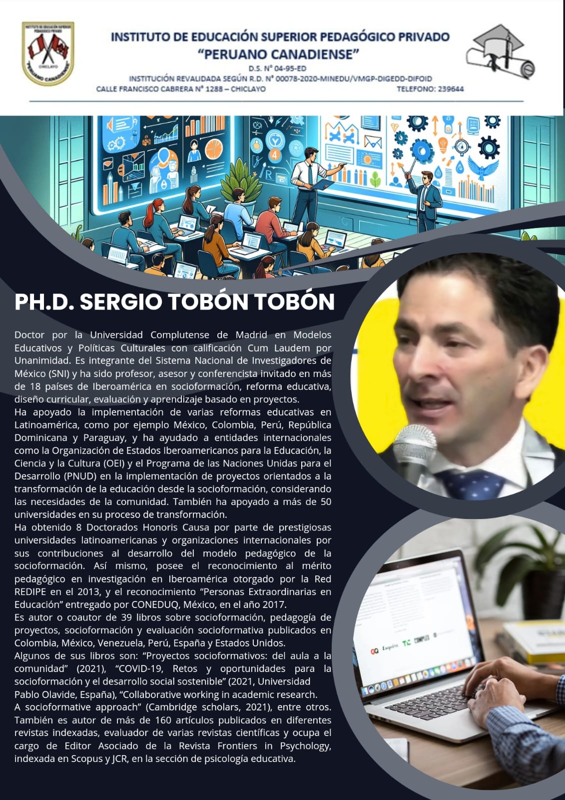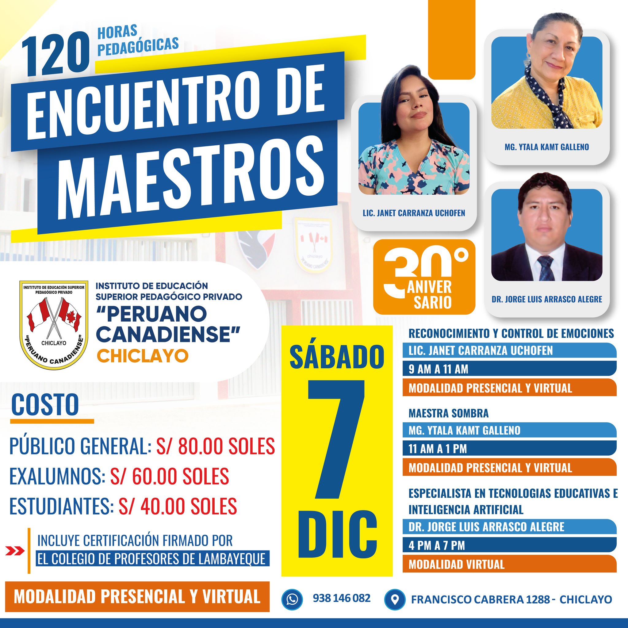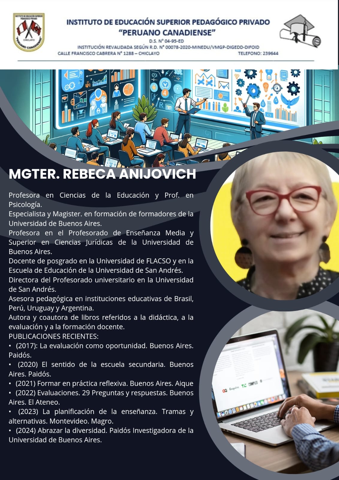 Somos un Instituto Superior Pedagógico que cuenta con más de 31 años de experiencia en el sector educativo en la región de Lambayeque. Nuestros egresados en un gran porcentaje laboran en instituciones educativas públicas y privadas del país. En nuestra región somos un Instituto Superior revalidado por el MINEDU, por lo cual queda demostrada la calidad de nuestros procesos y metodologías de aprendizaje. Así mismo para atender a más jóvenes de nuestra región y ofrecerles una oferta educativa de rápida inserción laboral, además de nuestras carreras profesionales de educación contamos con carreras técnicas de uno y dos años. Así mismo contamos con una infraestructura moderna y que está ubicada en el centro de nuestra ciudad. No dejes pasar esta oportunidad y se un profesional Ya !.